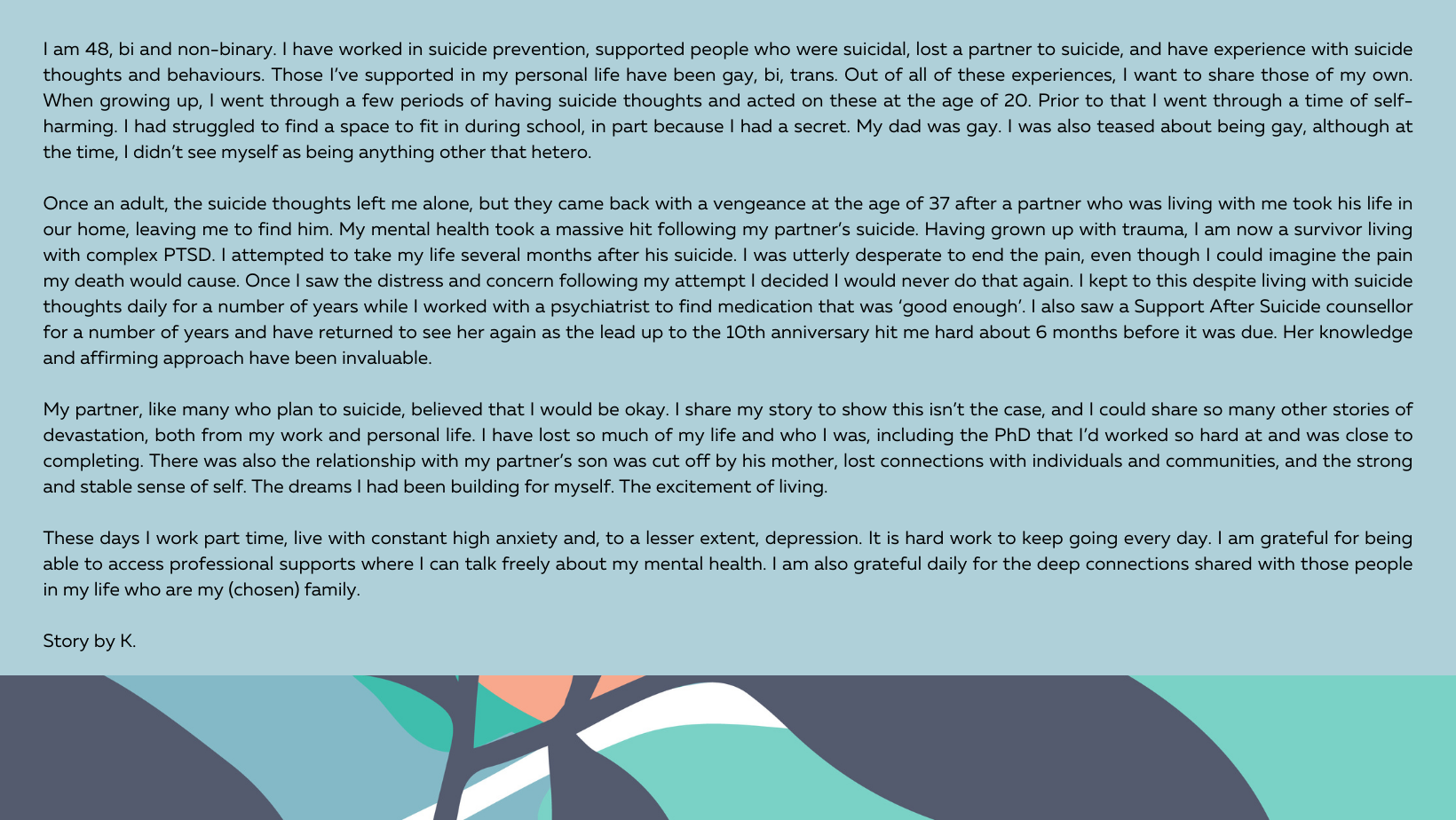 “My mental health took a massive hit following my partner’s suicide. Having grown up with trauma, I am now a survivor living with complex PTSD.”